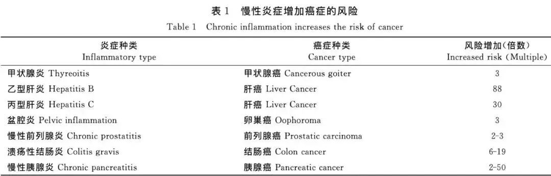 国外有关炎症相关癌症的流行病学数据表明:慢性炎症能增加癌症的风险(见下表)。