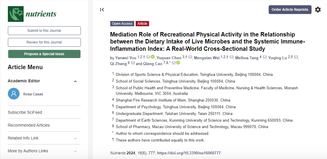 近日一项真实世界研究,又为饮食、运动“抗炎”增添了新证据。3月8日,清华大学的研究人员在《营养素》刊发的研究显示,摄入含中等活微生物的食物,与降低全身免疫炎症指数有关;更多的休闲体育活动,也与降低全身免疫炎症指数有关。