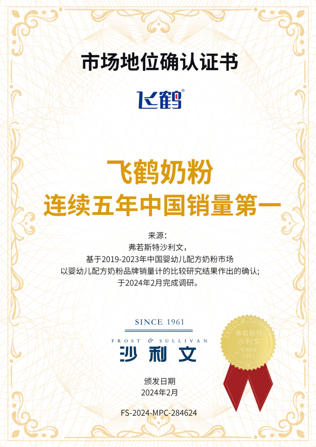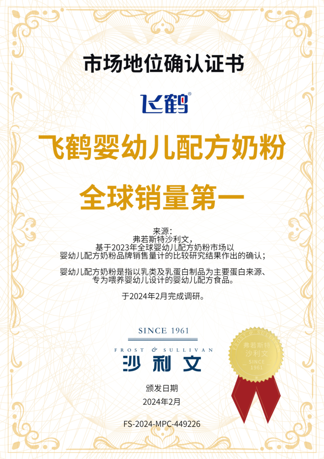 近日,国际权威调研机构弗若斯特沙利文(Frost & Sullivan),向飞鹤颁发多项“第一”认证证书。