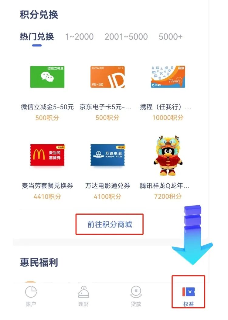 微众银行App首页→「权益页」→「前往积分商城」→即可进入积分商城。