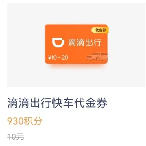比如价值10元的滴滴出行代金券,只需要价值9.3元的积分就可以兑换,不仅不花钱,还能打折省更多!
