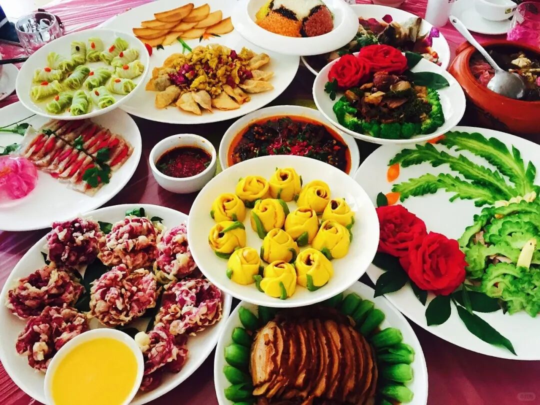 如今,云南各个地方的餐馆都专门推出了“鲜花宴”,鲜花本就是云南很多少数民族桌上的美食,佼佼白玉兰、妍妍红玫瑰,芙蓉金雀花、清汤节节高,一朵花就制成一道菜。最难得的是,经过一番煎、炸、煮、烹后,鲜花的芬芳仍留于颊齿间。还有一些非常独特的“鲜花宴”,更是“奢华富丽”,满桌子的菜肴,常食用的鲜花至少都超过30种。