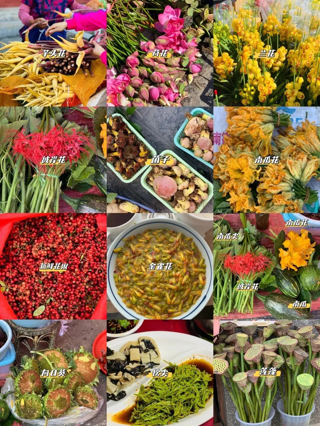 云南人吃花,不是满口芬芳的清高寡淡,而是用酸辣咸香,煎炒烹炸把浮在云端的风雅一下子拉入市井的嘈杂,是油炸、酱爆,搭配肥腻红烧肉后的人间风味。相比较雨季菌菇上市后的美味狂欢,春天的花草宴是另一番风味。