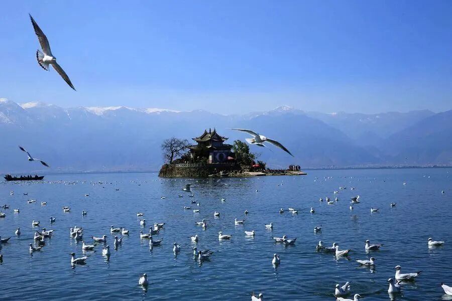 洱海:大理“风花雪月”四大名景之一,外形如同耳朵,是由西洱河塌陷形成的高原湖泊。共有三岛、四洲、五湖、九曲,湖水清澈见底,被称作“群山间的无瑕美玉”。蓝水和蓝天,山峦也泛着蓝,这是蓝的王国,盈盈水光交错波动,如一只只蓝色精灵。晨光熹微,朝霞的光芒洒向蔚蓝的海,幽深而烂漫的蓝配粉,一眼,便沉沦。