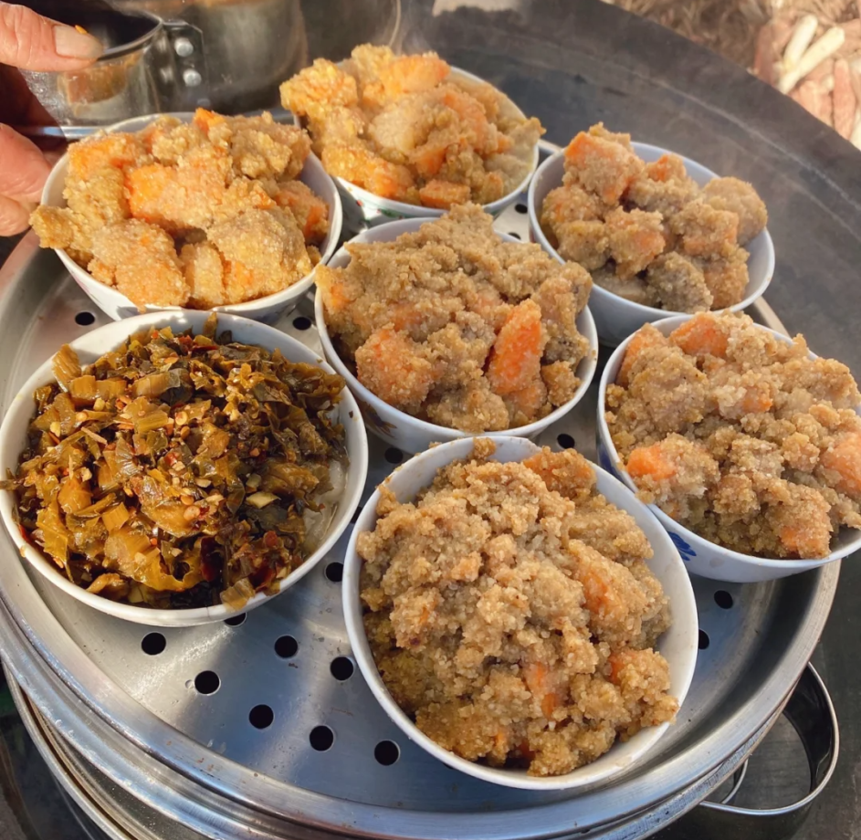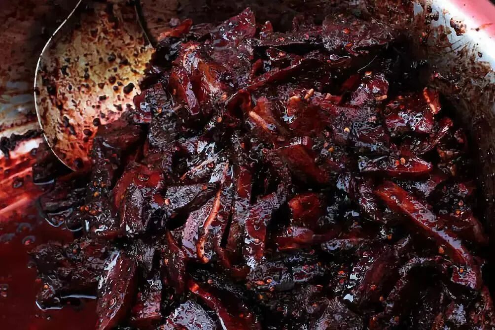 有的地方也叫“头刀菜”,就是用煮熟的猪肉配以生猪血、橄榄树皮、盐、味精、辣椒、花椒等佐料,经搅拌加工而成。“红肉”入口那是满口鲜红啊!味道自然不用说,但不是所有本地人都敢尝试这道特殊的菜肴~