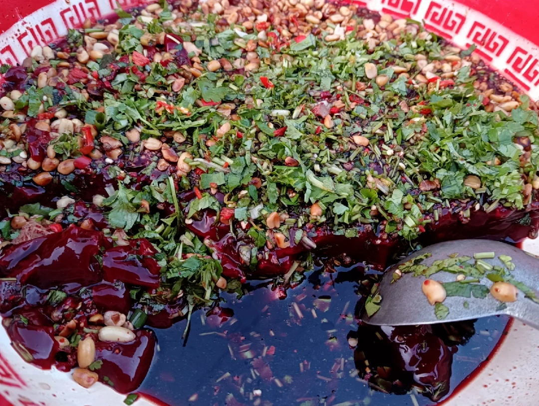 他们的头道猛菜,在汉语中被称为“血旺”或“白旺”。在盆中放入炒香或者烤制好的盐巴,然后等待着宰猪时的热血,第一时间用筷子单向地搅拌盆中的液体,一盆红彤彤的血旺就上桌了。