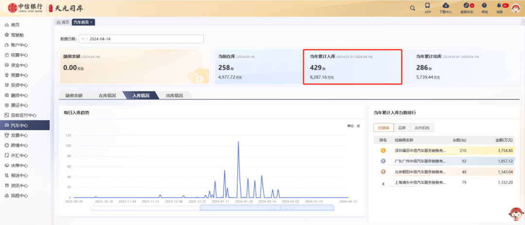 中信银行汽车经销商集团司库全新推出汽车中心首页服务,支持经销商集团客户查看集团入库车辆汇总信息,及时了解集团车辆入库情况。