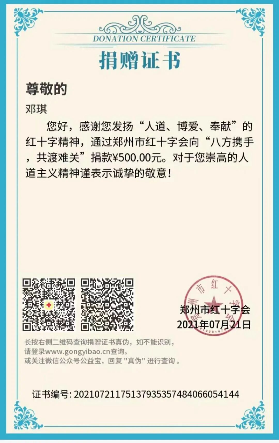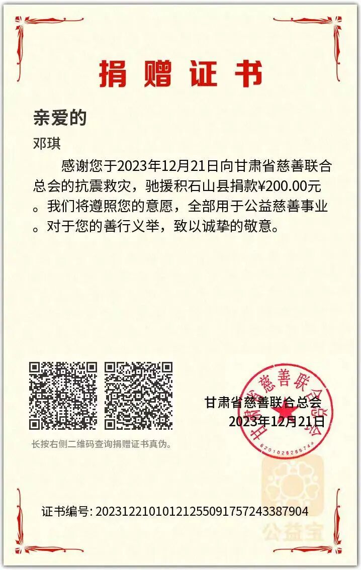 他曾多次将奖学金和勤工俭学挣得的工资捐款支援救灾,“虽然我还没有固定的收入来源,但是能贡献一点是一点,不捐过不了心里的那道坎。”邓琪说到。邓琪目前已签约某国防单位,关于自身未来的发展方向,他希望能将个人价值的实现融入国家发展的需要中,因为那里是自己心中的信仰所在。