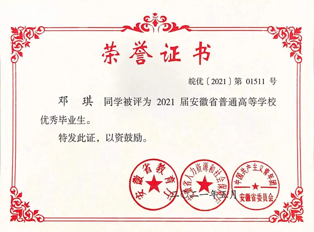 他明白大学不是努力的终点,而是自己通过知识改变命运的战场。除了上课、兼职和休息,其余的时间他几乎都是呆在图书馆内。他本科四年的平均学分绩名列专业第二,获得4次“校级一等奖学金”“国家励志奖学金”“校三好学生”等荣誉。在学习专业知识的同时,他积极参加学科竞赛,在“第十二届全国周培源大学生力学竞赛”中获得安徽赛区一等奖和国家三等奖的成绩。天道酬勤,他在本科毕业时被评为“安徽省优秀毕业生”,并被保送至南京航空航天大学机电学院攻读硕士研究生。