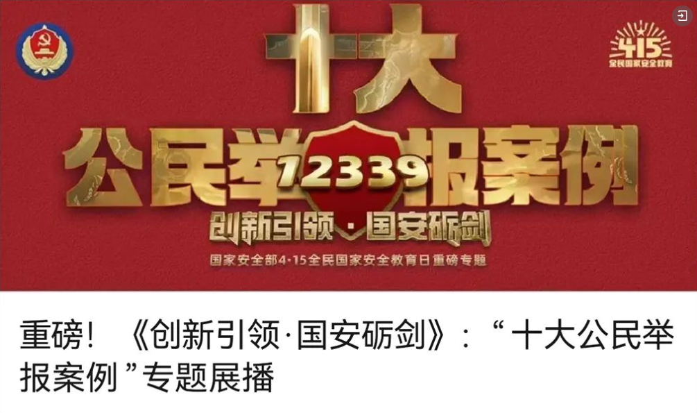 2015年11月,全国国家安全机关向社会发出通告,12339,是受理个人和组织发现的危害中华人民共和国国家安全的情况线索举报电话。