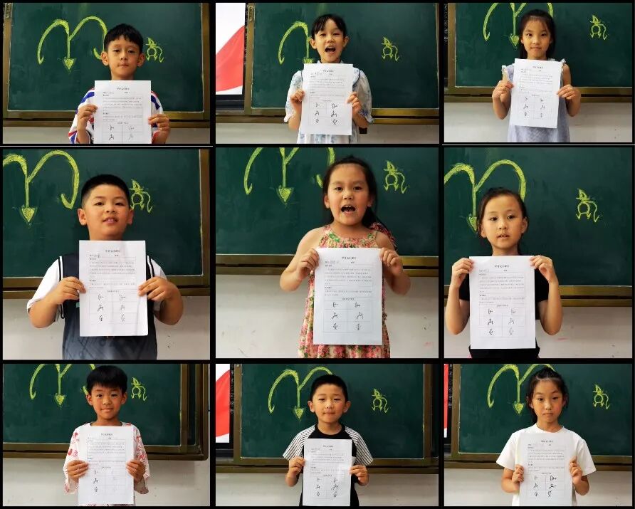 小朋友们展示自己书写的甲骨文