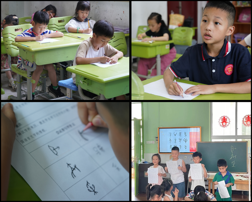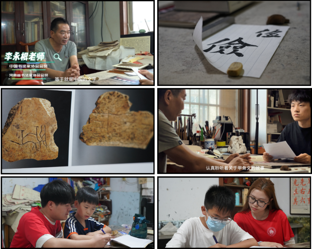志愿团队采访李永根老师场景,辅导小朋友们练习书法场景
