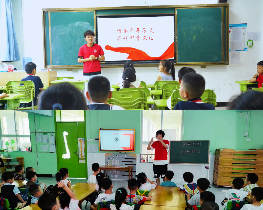 扎根基层,投身实践。他们前往郑州市经济技术开发区育人小学以及洛阳市偃师区槐庙幼儿园宣讲甲骨文知识,弘扬中华文化。为了激发未成年人对甲骨文的兴趣,精心准备了一系列的活动。通过制作图文丰富的PPT,志愿者们向小朋友们宣讲甲骨文的相关文化,并以生动的肢体语言展示了一些象形文字的来源和意义。