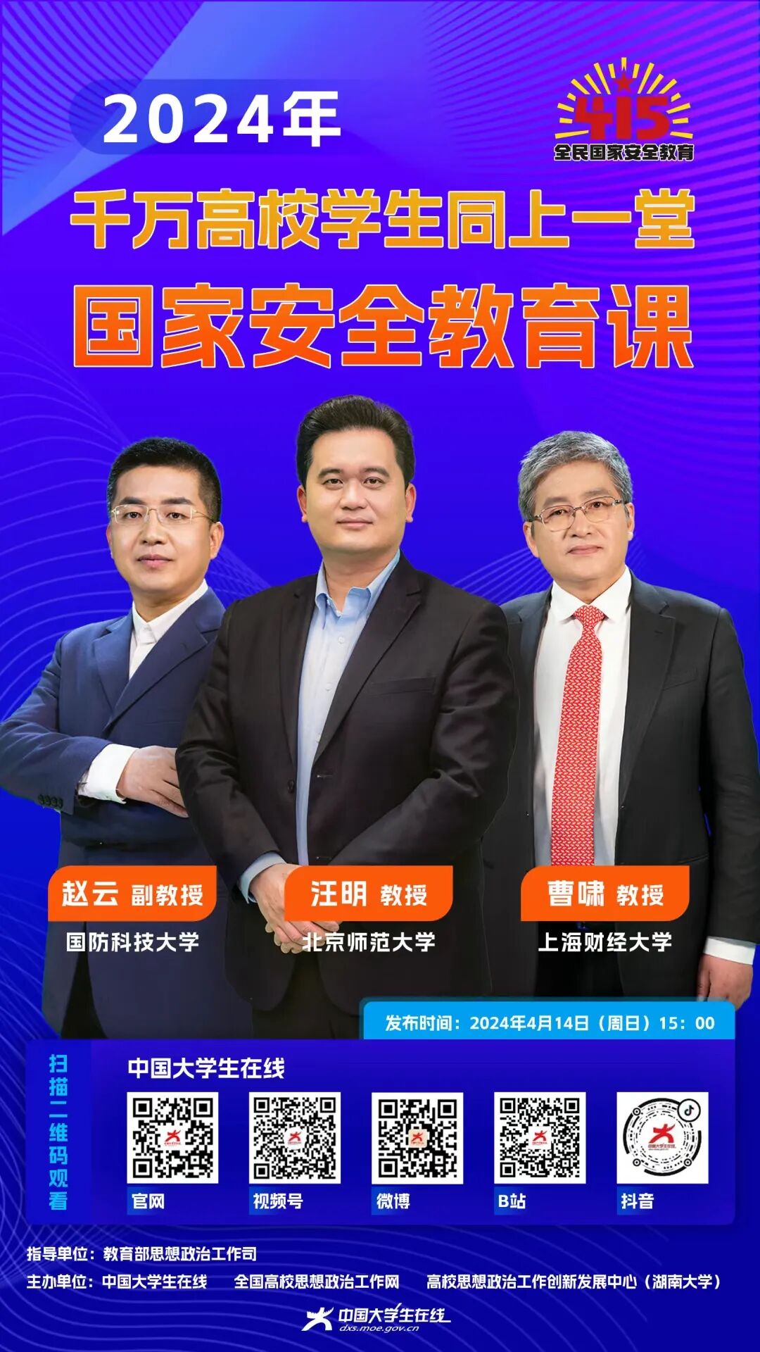 2024年4月14日15时,师生可通过中国大学生在线官网、视频号、微博、B站、抖音等直播平台观看。