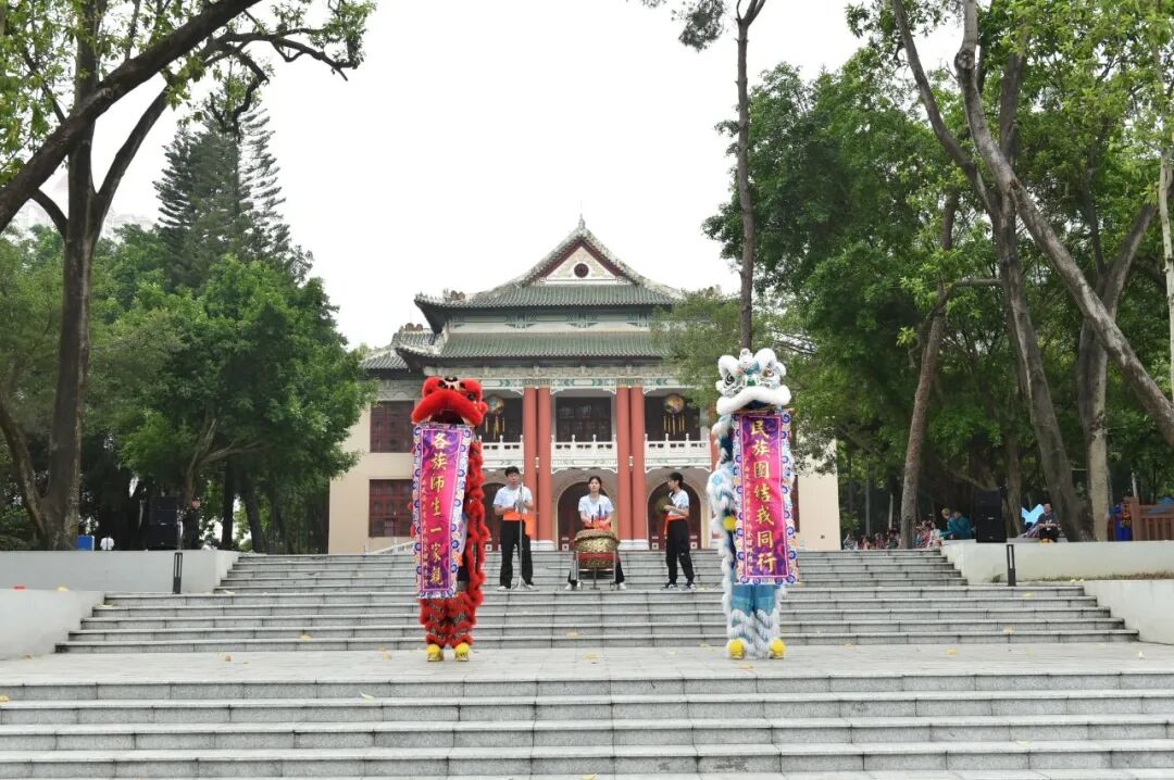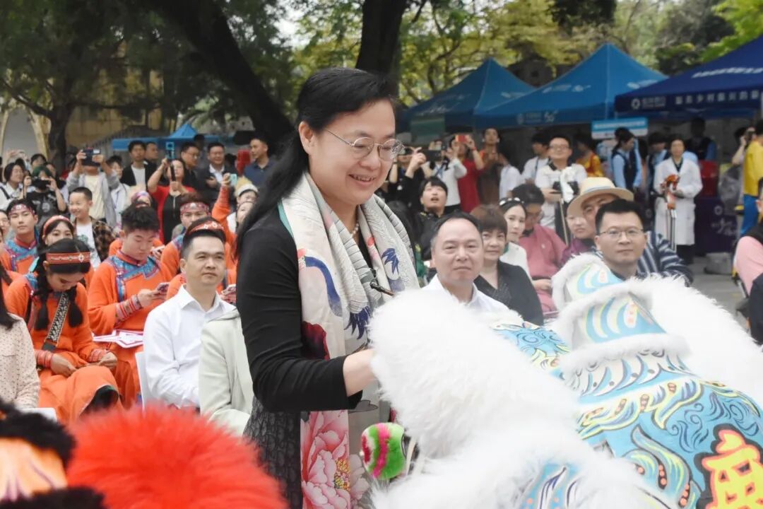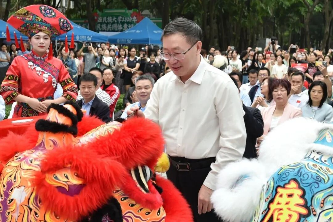 广西民族大学党委书记卞成林,校长韦仕珍为迎宾双狮点睛,活动正式拉开帷幕。鼓点铿锵有力,两头狮子时而嬉戏打闹,时而摇头摆尾,时而翘首仰视,动作俏皮可爱。随着鼓声大震,狮口中突出对联——各族师生一家亲,民族团结我同行,现场迅速升温。