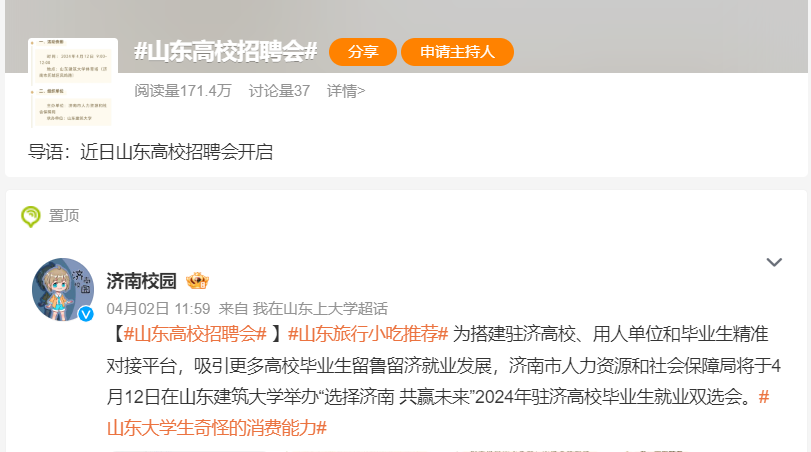 https://s.weibo.com/weibo?q=%23%E5%B1%B1%E4%B8%9C%E9%AB%98%E6%A0%A1%E6%8B%9B%E8%81%98%E4%BC%9A%23&s_channel=4&s_trans=7173071569_