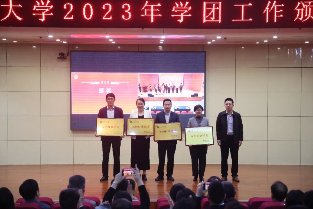 卢国强、李兆祥分别宣读了2023年度学团工作先进集体、先进个人名单以及获得省级以上荣誉名单。会上播放了2023年辅导员年度人物宣传片。与会领导为学团工作先进单位、五四红旗团委、创新创业先进单位、辅导员年度人物、优秀辅导员,以及获得省级以上表彰奖励的辅导员代表颁奖。![]()