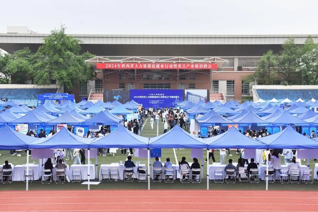 为深入贯彻落实党的二十大精神,围绕省委“三个年”活动,加强重点产业链急需紧缺人才目录成果转化应用,4月16日,2024年陕西省人力资源促就业行动暨重点产业链招聘活动在我校长安校区成功举办。