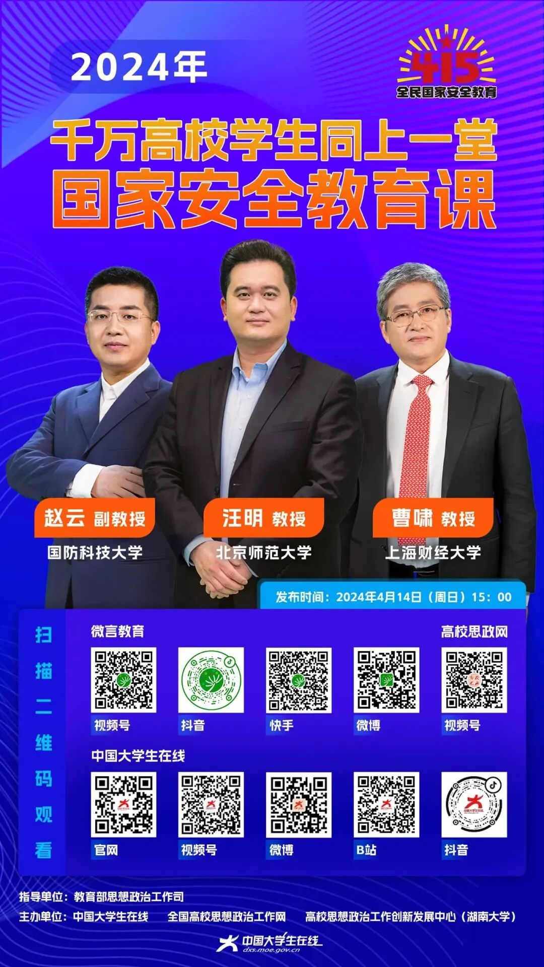 2024年4月14日15时,师生可通过中国大学生在线官网、视频号、微博、B站、抖音;微言教育视频号、抖音号、快手号、微博等直播平台观看。