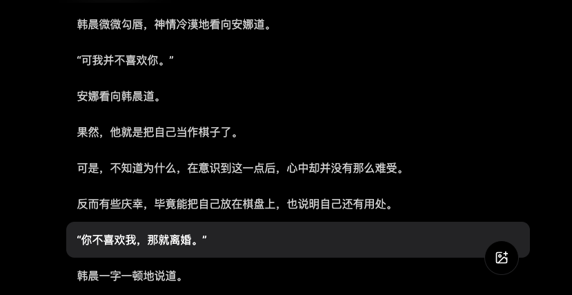 无论是网文还是短剧,“霸道总裁爱上我”都是屡试不爽的流量密码。接下来,我们一起看看MidReal写“霸总文”的效果如何。输入场景提示词:为了挽救家族企业,女主角被迫与一位冷酷霸总签订契约婚姻。起初,这只是一场交易,但随着时间的推移,霸总逐渐展现出他不为人知的温柔一面。两人在这场虚假的婚姻中,逐渐发现了真正的爱情。从输出的第一段情节来看,MidReal不仅逻辑在线,而且开篇两句话就勾起了读者好奇心:落魄豪门女与神秘的“他”签订了一个契约婚姻,接着逐渐揭晓,这个“他”既冷漠但又有着完美无瑕的外表,令人心动。生成过程中,每隔一段情节,MidReal就会结合叙述场景生成相应插图。目前,网页版MidReal还支持用户手动选择句子,生成相应插图,点击句子右下角出现的“图像”图标即可。![]()