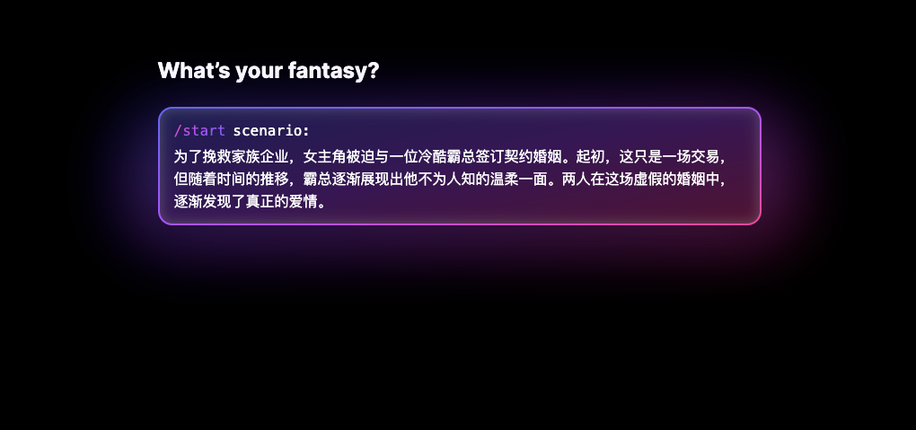 没有对胃口的内容,你还可以自产自磕。回到页面开头输入一个场景或一段设定,即可让AI替你把脑海中的幻想变成网文味十足的故事。