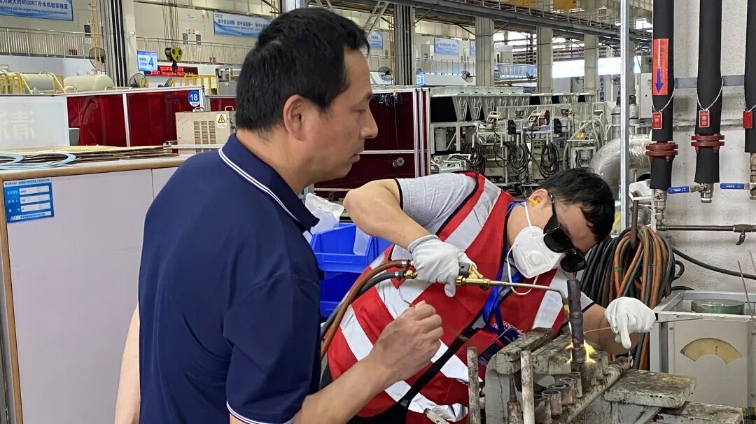 如果说压缩机是空调的心脏,那其中连接的管路就是血管,管路的健康影响着冷媒流通和机组运行,而现场人员的焊接操作是决定机组能否长期稳定运行的关键,特此绿控安排曾获珠海市焊接比赛一等奖的赖(佳勇)工,并邀请负责全公司人员焊接培训的胡(新广)工和拥有30年丰富经验曾解决过现场无数焊接难题的邓(卫国)工为学员进行焊接实操培训。
