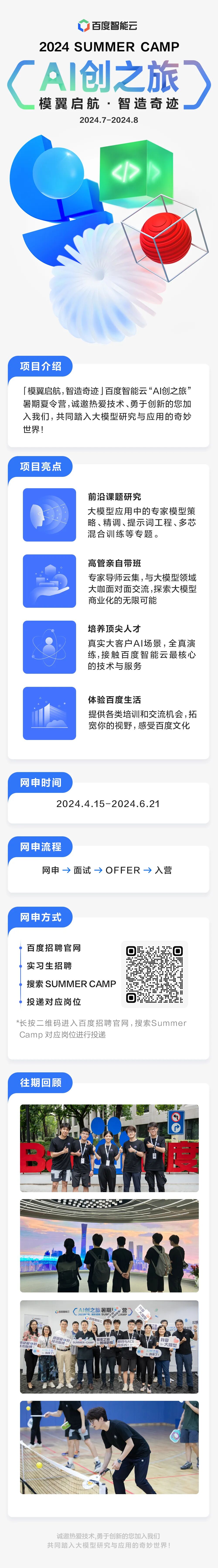 摘要:「模翼启航,智造奇迹」,百度智能云 2024 “AI创之旅” 暑期夏令营,诚邀热爱技术,勇于创新的在校优秀学子,共同踏入大模型研究与应用的奇妙世界!