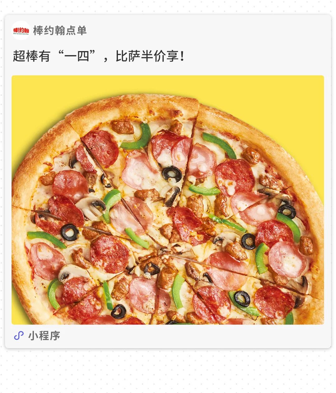 2、个人装比萨,七款超值比萨(蜂蜜芥末鳕鱼比萨、牛肉多多比萨、金枪鱼芝士比萨、奶油培根蘑菇比萨、香肠培根比萨、意大利风味猪肉比萨、意式肉酱比萨)、加菲猫|车达芝士比萨、金龙鸿运满满比萨、减卡路里比萨、羊肚菌菌菇鸡肉比萨传统手拍、“0.1”薄脆羊肚菌菌菇鸡肉比萨及16英寸比萨均不参与超棒有“一四”比萨半价活动。