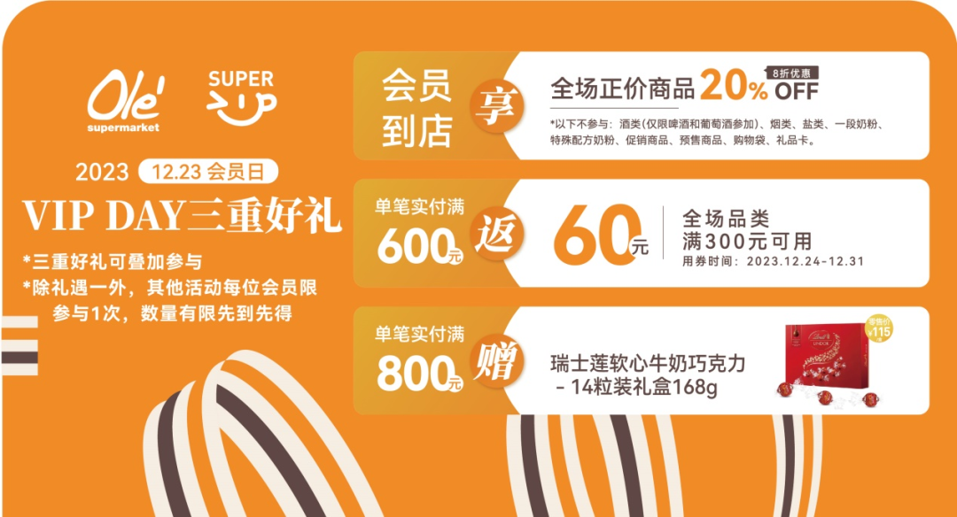 ✔️ 12.23-12.31日,会员到店单笔实付满600元返Olé全场满300减60元券(用券日期:12.24-12.31)