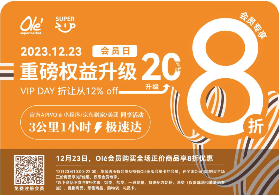 12月23日当天10:00-22:00时,华润通所有会员及持有Olé旧版会员卡的会员,到Olé线下门店购物即享全场正价商品8折优惠(特价及特殊商品除外),同时Olé门店为大家准备了很多惊喜活动,等大家来参与!