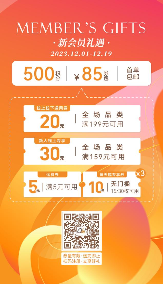 新会员注册即可获得85元券包、500积分、线上下首单全国包邮服务,点击下方图片即可注册会员参与活动。