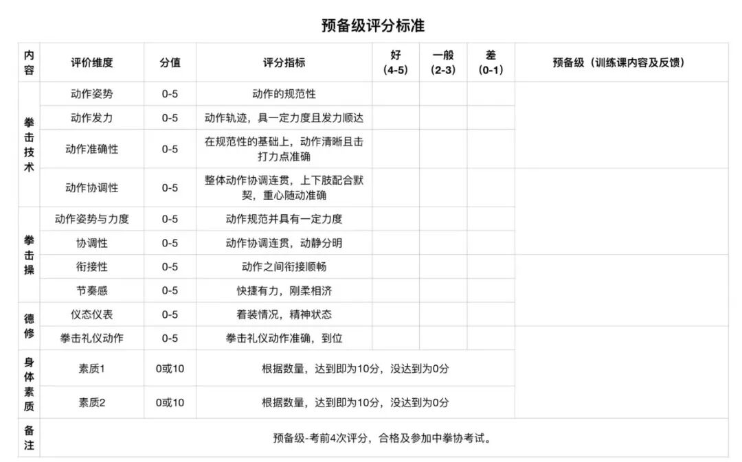 对应报考级别,玩儿拳为每位考生设计了考级训练表和每次训练的模拟测试单,需完成对应课时训练内容和达标测试分数才能最终参加此次考级。