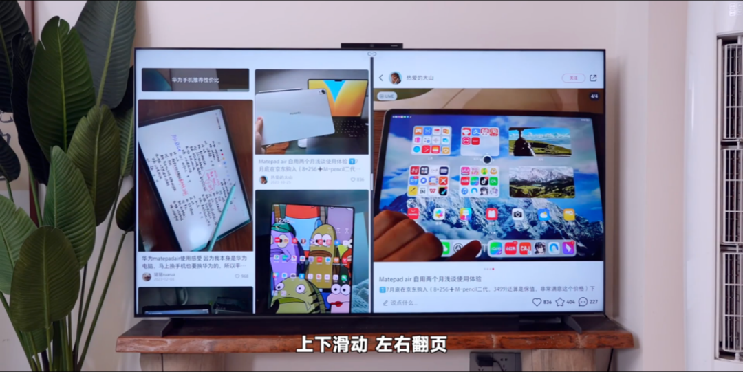 以小红书APP为例,用户通过超级桌面可以直接在华为智慧屏 V5 系列75英寸打开小红书APP,通过华为灵犀指向遥控操作,用大屏幕刷美食、刷景点、刷穿搭攻略。看到喜欢的衣服还能直接打开购物软件进行挑选,在进行挑选时,大屏幕可以同时对比多款商品,这种体验是传统智能电视无法实现的。