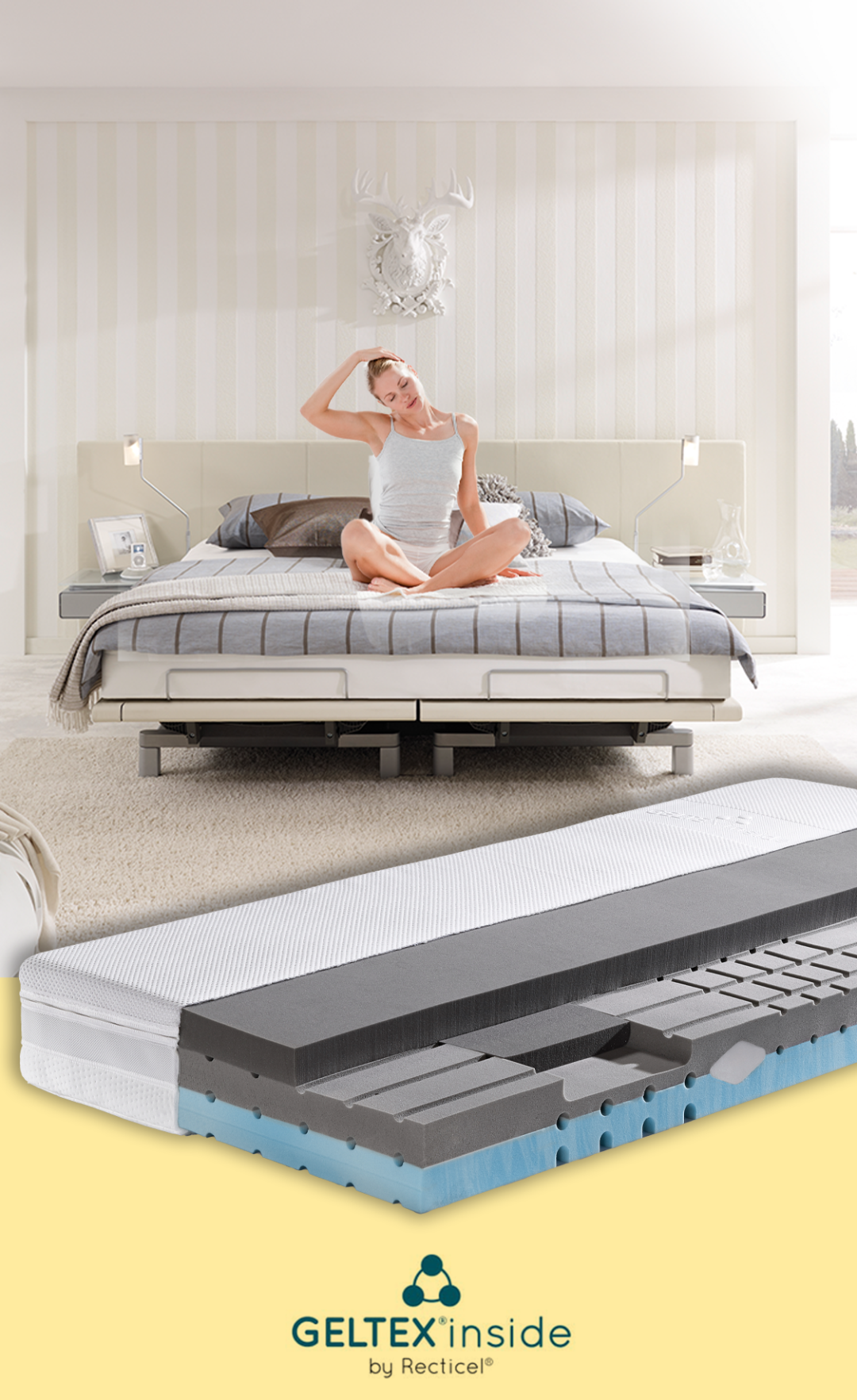 swissflex®瑞福睡在睡眠领域里,坚持科学改变睡眠,历经百年的睡眠技术研发结合科学创新,坚持使用全球严格的环保标准和科学睡眠标准的材质,versa系列床垫使用GELTEX®3.0专利材质作为床垫的舒适层与支撑层,使它拥有出色的支撑力和释压性,能够根据人体的重量和形状,自动释放身体压力,使骨骼与肌肉得到充分的支撑和全身零压力。