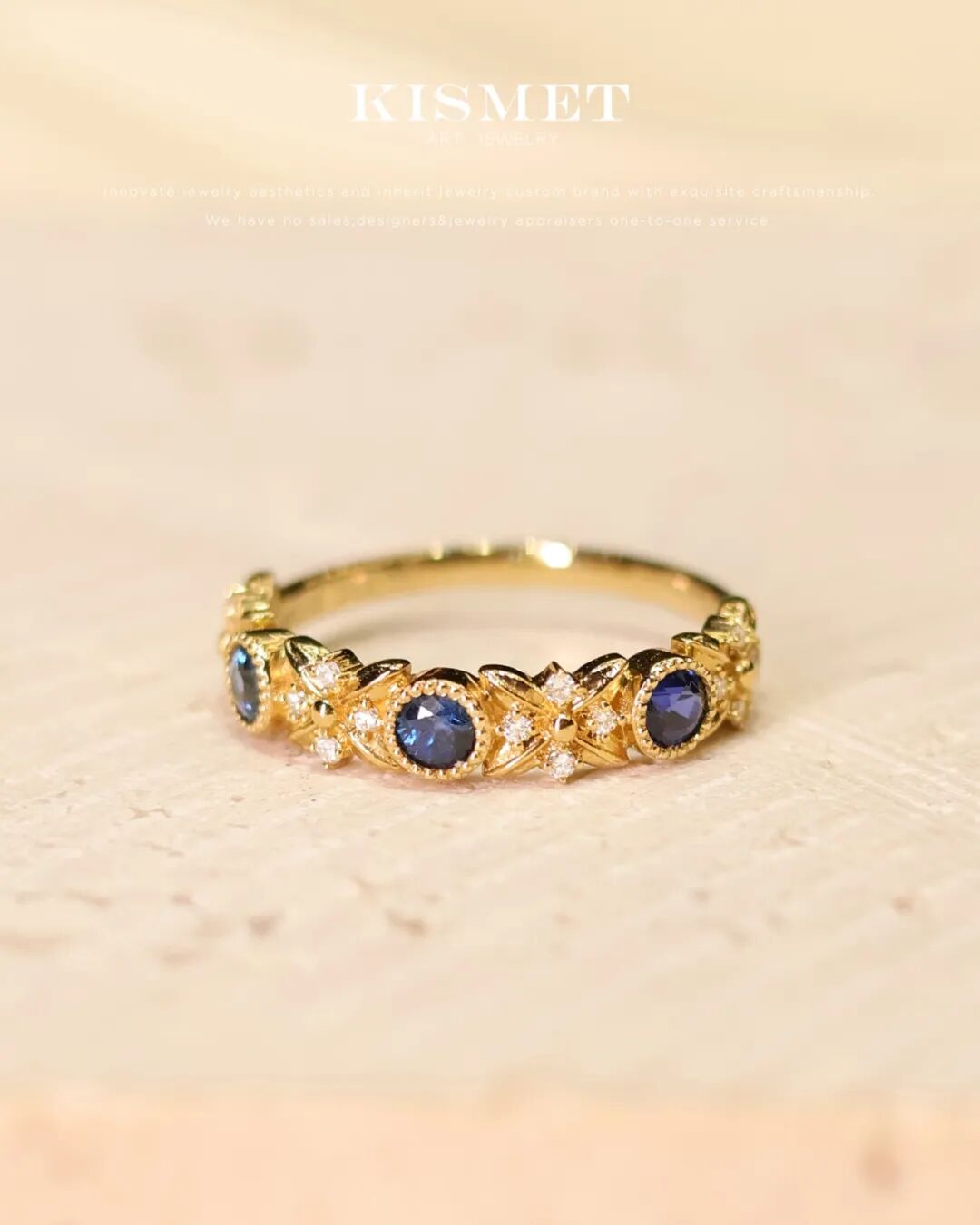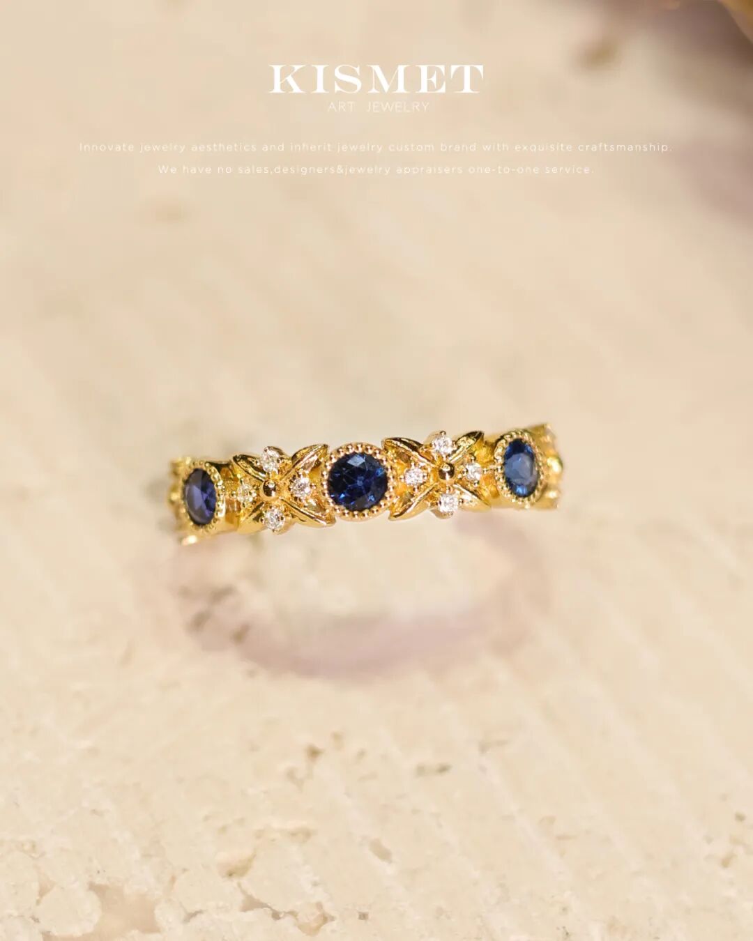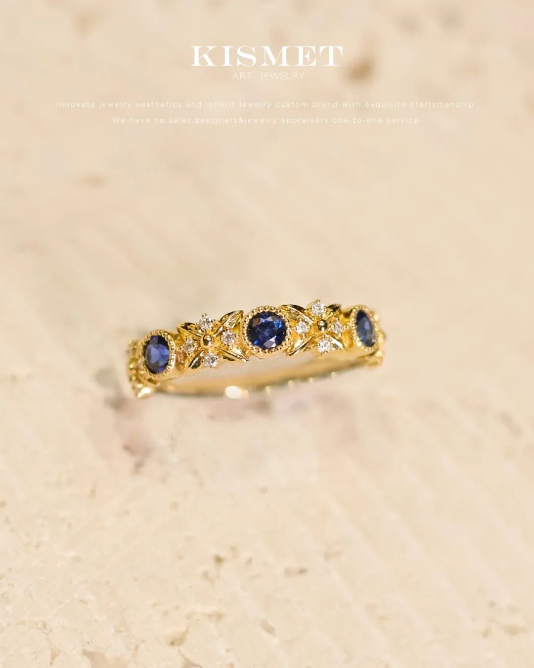 采用皇家蓝蓝宝石作为主石,代表深邃不可战胜,代表一世的守护誓言。复古露珠边刻画整体的造型,点缀小钻,如同骑士的肩章给予你最为忠诚的守护。
