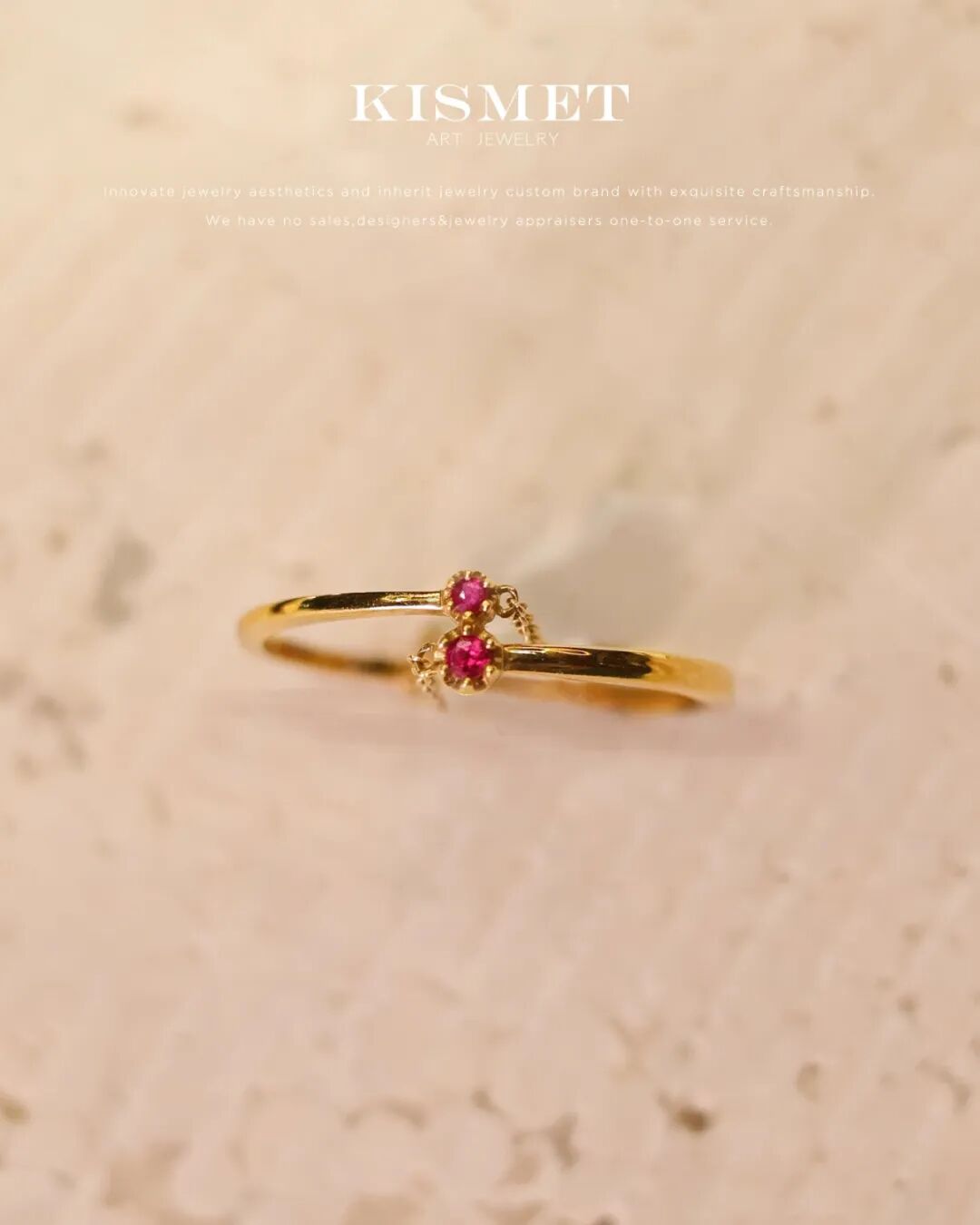 低调地在素圈基础上为两端的红宝石缀上细链,为纤巧的指尖做了点缀。百搭又精巧,希望您喜欢。