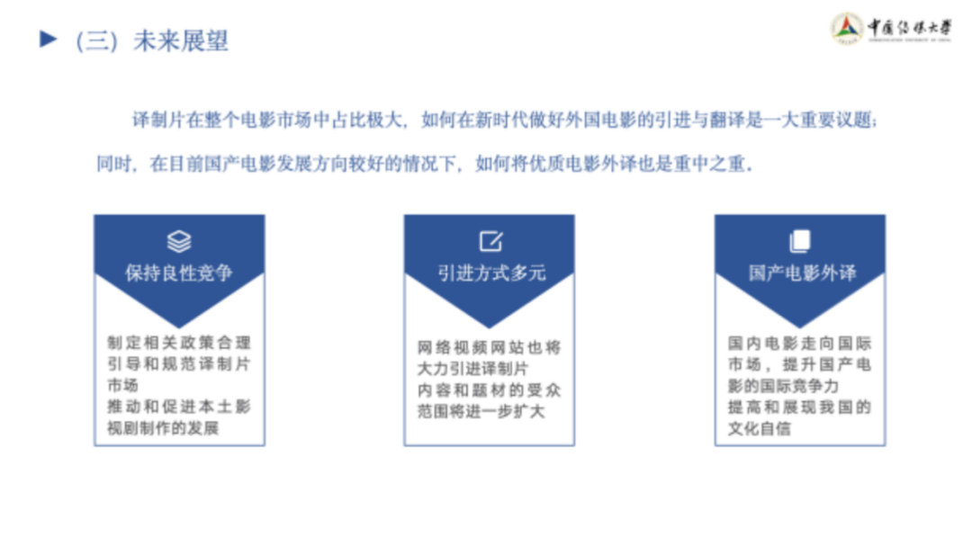 电影反映艺术,亦在记录历史。二十大报告中指出,要推进文化自信自强,铸就社会主义文化新辉煌。中国电影的发展为讲好中国故事、传播好中国声音,展现可信、可爱、可敬的中国形象做出了贡献,作为新时代的翻译学习者,我们更应当学习这种坚定文化自信、不断前进发展的信念,在翻译领域深耕不辍,笃行致远,为实现中华民族的伟大复兴而不懈奋斗!