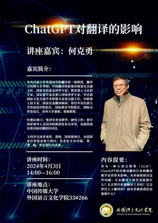 4月3日下午,中央民族大学外国语学院翻译系何克勇教授应邀于学院266报告厅为我院师生作学术讲座,题为“ChatGPT对翻译的影响”。外国语言文化学院党委书记李烨辉、院长文春英、副院长刘颖、谢飞以及数十位研究生导师和硕士研究生到场聆听交流。讲座由外国语言文化学院副院长刘颖主持。