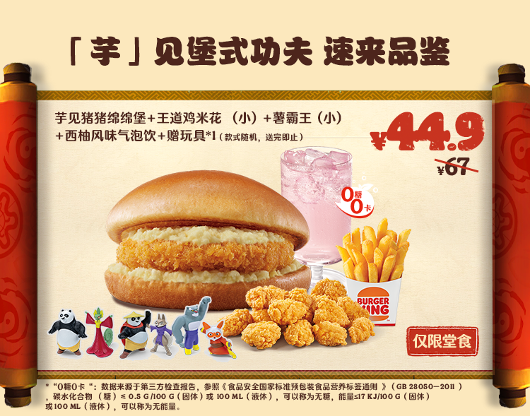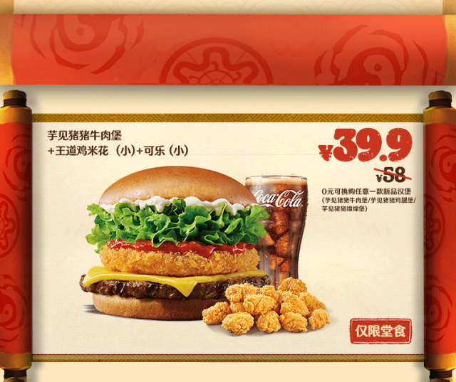 *非外卖渠道价格解释:图示如有划线价格,并非指原价,而是指不参加优惠活动情况下该产品在汉堡王指定门店销售的常规价格(或者指其中所含单品的常规单买价总和)或汉堡王门店建议零售价。除非图示另有解释,否则图示如有节省的金额或折扣比例,是与不参加优惠活动情况下在汉堡王指定门店单独购买该产品的常规价格(或者其中所含单品的常规单买价总和)或汉堡王门店建议零售价相比较。若需要查询当前门店销售的常规价格,可查看相应门店菜单或详询店员。