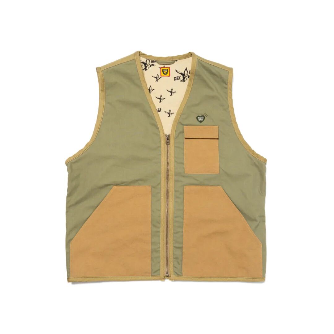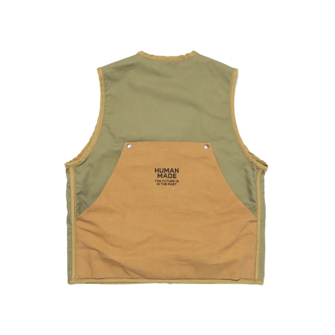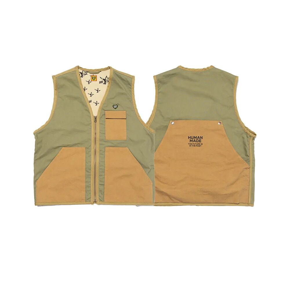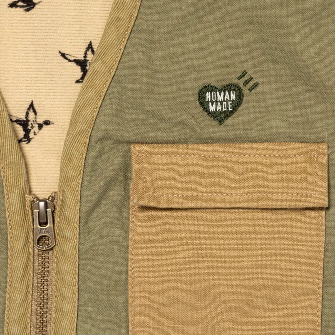 HUMAN MADE 注重细节和面料选择的马甲,其特点在于各部分的颜色搭配以及内衬的灯芯绒部分印有迷彩动物图案。