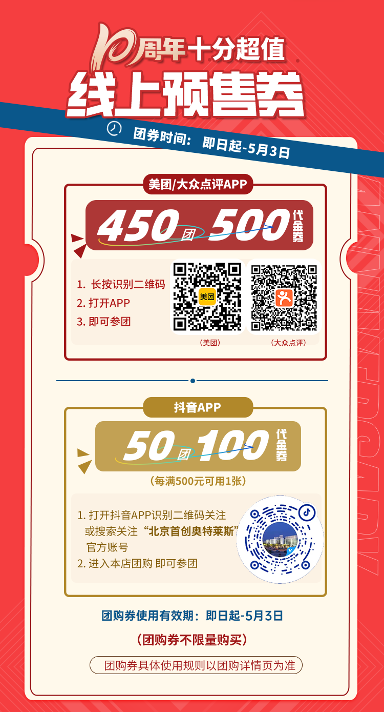 注:所有赠品数量有限,先到先得,赠完即止;赠券使用规则请以券面明示为准;上述各品牌促销以店内公示为准;北京首创奥莱有权在法律允许的范围内对活动进行微调