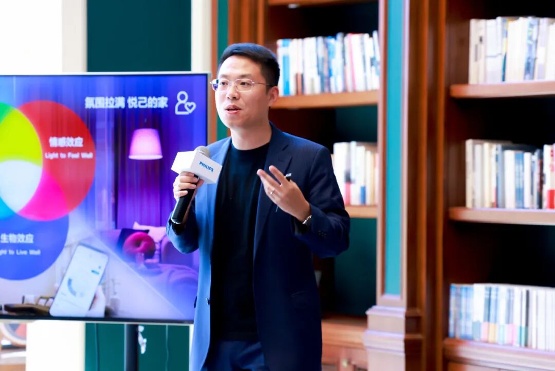 昕诺飞中国区消费照明事业部市场总监赵玉博上台,深入阐述了家和人与光之间的微妙联系。在视觉层面,我们追求舒适健康、全局护眼;情感层面,渴望营造温馨的居家氛围;生物层面,注重健康节律与专注高效的平衡。而全局护眼吸顶灯V9,以其全空间、全场景、全实测的全局光特性,完美契合了这三个层面的用光需求。