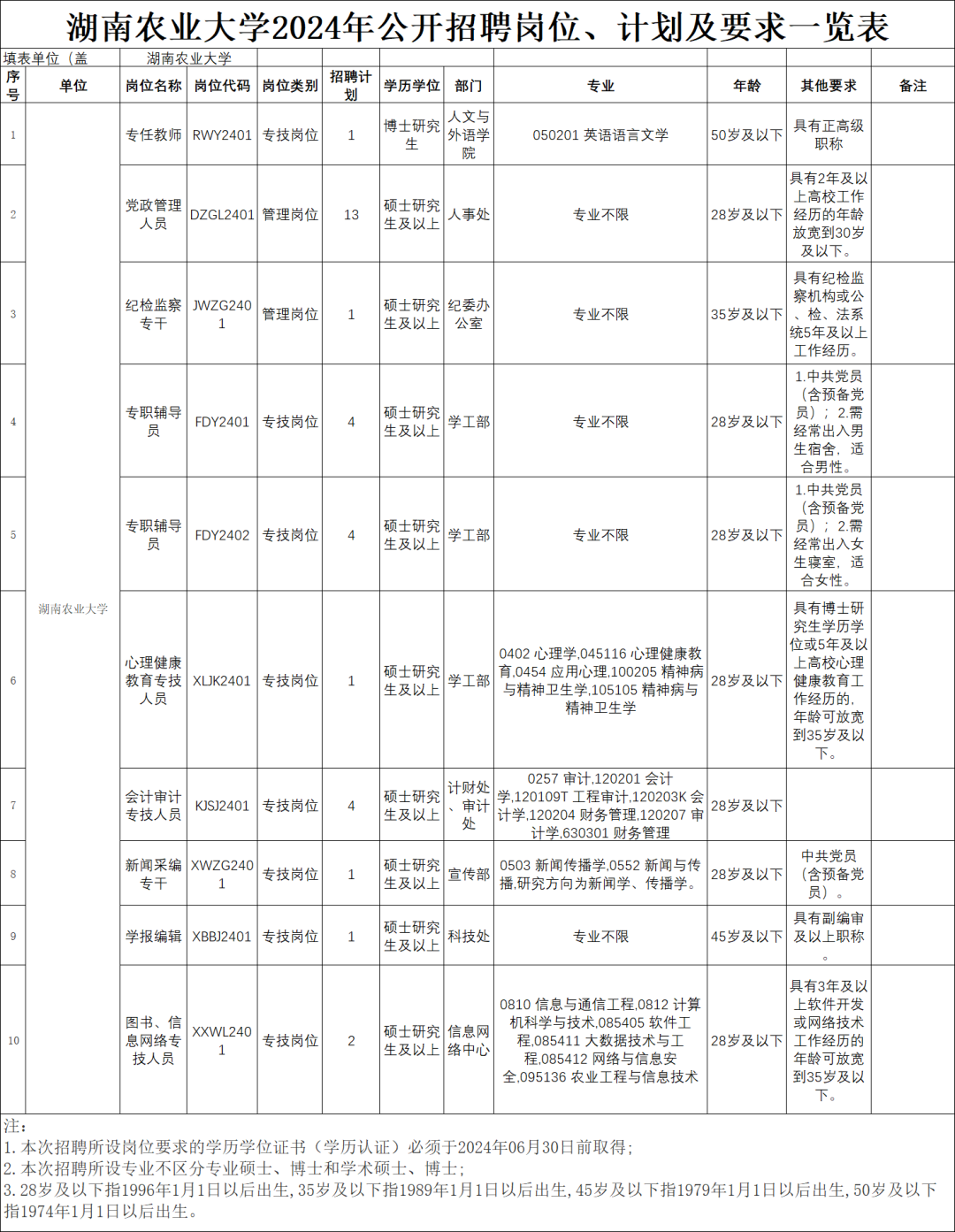 招聘信息通过湖南省人力资源和社会保障(http://rst.hunan.gov.cn/)、湖南农业大学官网向社会公开发布。采取网上报名的方式,每人限报一个岗位,多报则取消应聘资格。请应聘人员按如下流程进行报名:登录湖南农业大学官网→“我要加盟”→报名系统→注册用户→根据“应聘须知”,按岗位要求填写相关个人信息→按要求将报考岗位所需的相关证明材料原件扫描上传→保存并提交信息。提交信息后,审核状态显示为“已提交,二级单位待审核”即为报名成功。(2)各阶段学历学位证书、职称证书,暂未取得学历学位证书的应届毕业生还须提供学信网下载的学籍在线验证报告;(3)岗位要求为中共党员(含预备党员)的,必须上传由所在党组织开具,有经办人签字(手写或签章,打印无效)并加盖公章的党员身份证明,落款日期须为2024年4月1日以后;(4)岗位要求有工作经历的,须提供由工作单位人事部门出具的工作经历证明(内容含工作起始时间,工作岗位);(5)已有工作单位的应聘人员须由所在单位出具同意报考证明并加盖所在单位人事部门公章(可入围面试后提供)。应聘人员的学历(学位)必须为国家承认的学历(学位),出国留学人员学历应通过教育部相关部门的学历认证。学历学位证书必须于2024年6月30日前取得,否则取消应聘资格。工作经历证明须由工作单位的人事部门出具书面证明(工作起始时间,工作岗位),在全日制学校就读期间参加社会实践、实习、兼职等不能视为工作经历,工作经历年限按足年足月累计计算,以2024年6月30日为截止日期。本次招聘所设专业不区分专业硕士、博士和学术硕士、博士。资格审查分为初审和复审,资格审查贯穿招聘工作全过程,任何环节发现应聘人员不符合岗位报名条件或提供的材料弄虚作假,一经查实,则取消考试或聘用资格。1.初审:根据岗位招聘条件对应聘人员网上报名进行资格初审,通过资格初审人员名单在湖南农业大学人才招聘网公布。通过资格初审人员请自行在湖南农业大学人才招聘网报名端口打印准考证。考试时间、地点见准考证。1号岗位:通过资格初审人员全部参加资格复审,应聘人员须携带报名材料原件参加资格复审。2-10号岗位:笔试结束后,根据应聘同一岗位笔试成绩排名先后,按岗位招聘计划数1:5的比例确定资格复审人员名单,应聘人员须携带报名材料原件参加资格复审。资格复审时间、地点以电话通知为准。2-10号岗位报名人数与招聘计划数的比例原则上不低于3:1。对少数专业特殊确实难以形成竞争的岗位,经报请湖南省人力资源和社会保障厅同意后,根据实际情况可适当降低开考比例、核减或取消岗位招聘计划。(1)1号岗位:采取试讲和面试相结合的方式进行(按百分制折算成综合成绩,试讲成绩占综合成绩的50%,面试成绩占综合成绩的50%)。试讲:通过资格复审人员全部参加试讲。试讲采取授课的方式进行,主要测试应聘人员的专业知识、教学思路、教学技能等,总分100分。面试:根据应聘同一岗位试讲成绩排名先后,按岗位招聘计划数1:5的比例确定入围面试人员。面试采取答辩的方式,主要测试应聘人员的师德师风、综合素质、专业能力、人岗匹配度等,总分100分。(2)2-10号岗位:采取笔试和面试相结合的方式进行(按百分制折算成综合成绩,笔试成绩和面试成绩各占综合成绩的50%)。笔试:通过资格初审人员全部参加笔试。笔试采取闭卷的方式,主要测试应聘人员对公共基础知识和相应岗位的专业理论知识等的掌握程度,总分100分。面试:根据应聘同一岗位笔试成绩排名先后,按岗位招聘计划数1:5的比例确定进入面试人员名单(分数并列者一并入围)。面试采取结构化面试的方式,主要测试应聘人员的师德师风、综合素质、专业能力、人岗匹配度等,总分100分。设置综合成绩合格分数线80分。如应聘同一岗位所有人员都未达到合格分数线,则取消该岗位招聘计划。经批准降低开考比例开考,或实际参考人数未达到开考比例的,笔试、面试等环节(以实际考试环节为准)均设置合格分数线70分。未达到合格分数线的,不再进入公开招聘下一环节。达到开考比例的岗位,设置综合成绩合格分数线70分。如应聘同一岗位所有人员都未达到合格分数线,则取消该岗位招聘计划。应聘人员参加笔试、试讲、面试须携带身份证原件和准考证,各环节的考试成绩在湖南农业大学人才招聘网公布。根据应聘同一岗位综合成绩(综合成绩精确到小数点后两位。综合成绩相同的,1号岗位以面试成绩为准,2-10号岗位以笔试成绩为准)排名先后,按岗位招聘计划数1:1的比例等额确定体检和考察人员。体检参照公务员录用标准执行。体检合格者进入考察环节。主要考察应聘人员遵纪守法、思想政治表现、道德品质、业务能力、工作实绩等情况,并对其资格条件进行复查。有体检或考察不合格者或放弃资格者,按应聘同一岗位综合成绩排名依次等额递补2次。