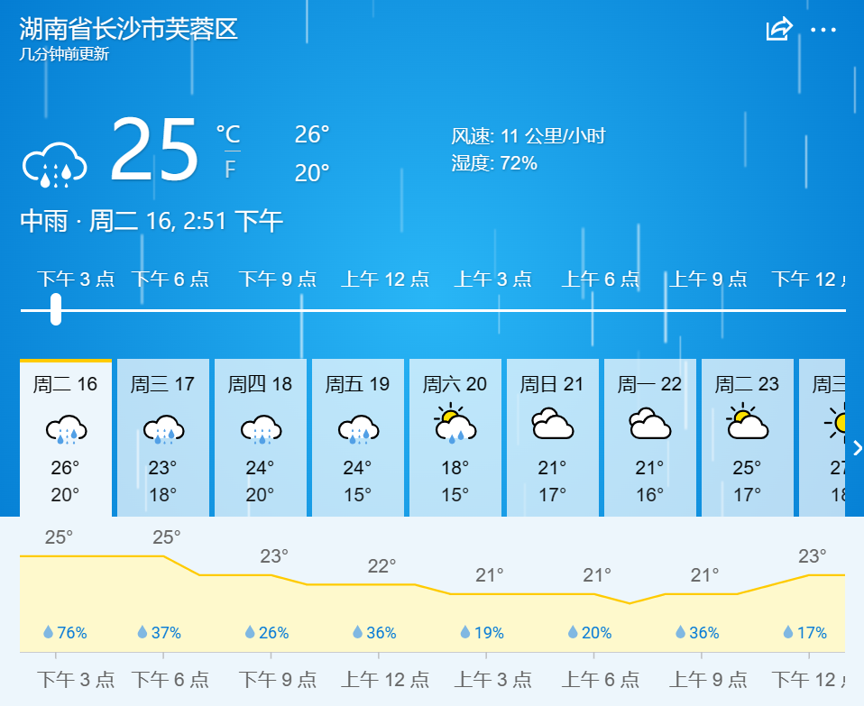 长沙市气象台今日8时发布暴雨黄色预警信号:预计湘江新区、雨花区、天心区、芙蓉区、开福区、长沙县8时至14时降雨量将达50毫米以上,最大小时雨强30毫米,致灾风险较高,请注意防范。