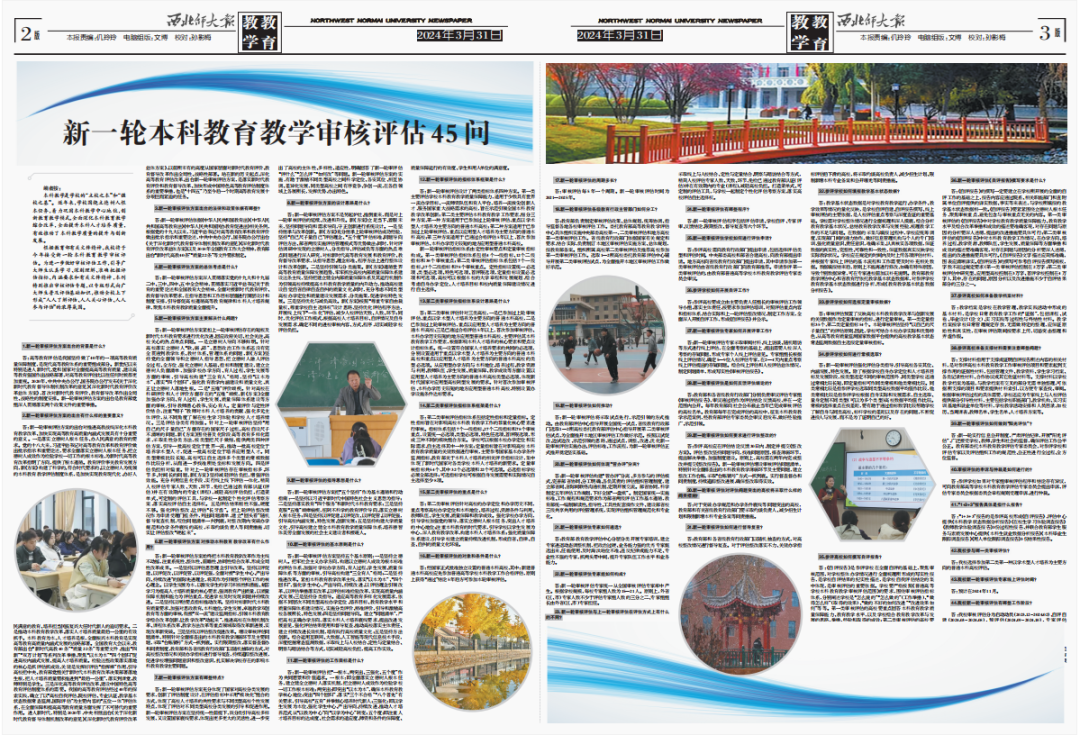根据教育部有关文件精神,我校将于今年接受新一轮本科教育教学审核评估。为进一步做好审核评估工作,引导广大师生认真学习、深刻理解、准确把握评估指标、内涵要求和有关文件精神,本刊特别推出审核评估专题,以专版形式向广大师生普及评估基础知识,推动全校上下形成“人人了解评估、人人关心评估、人人参与评估”的浓厚氛围。
