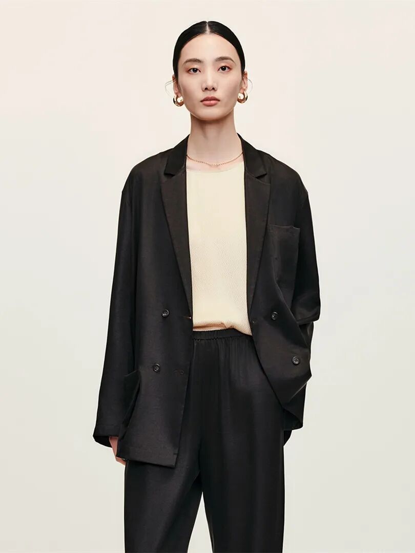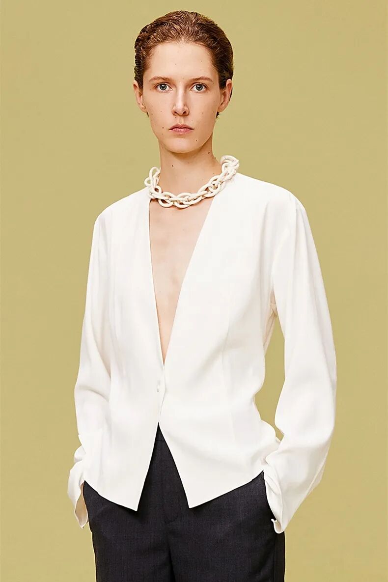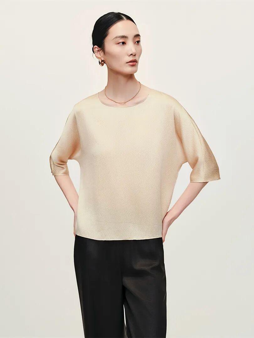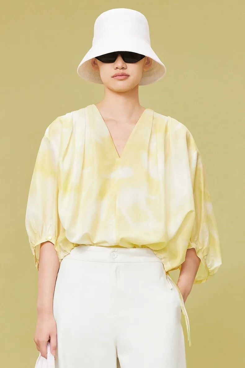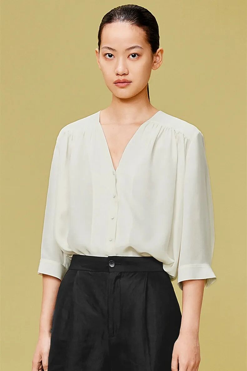 甄选18M双绉真丝面料,垂坠性好,柔软舒适,触感顺滑。V领借肩加前片碎褶设计,层次感分明,表面微皱有肌理。