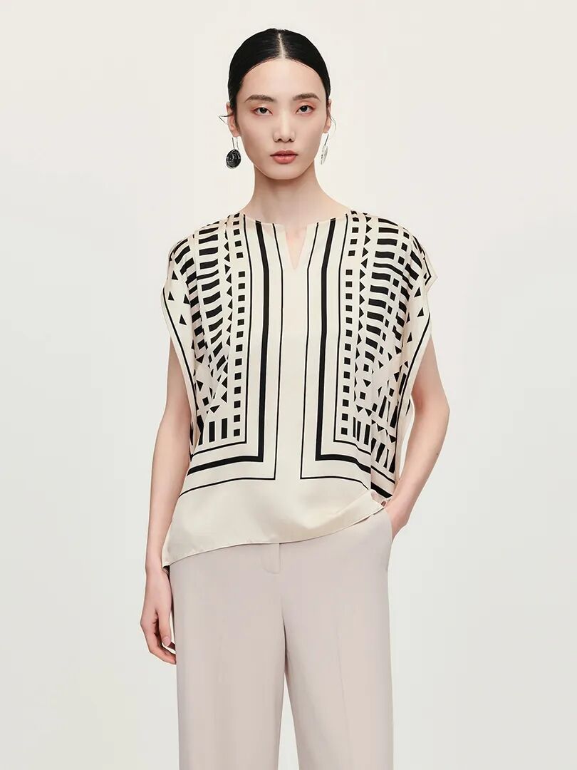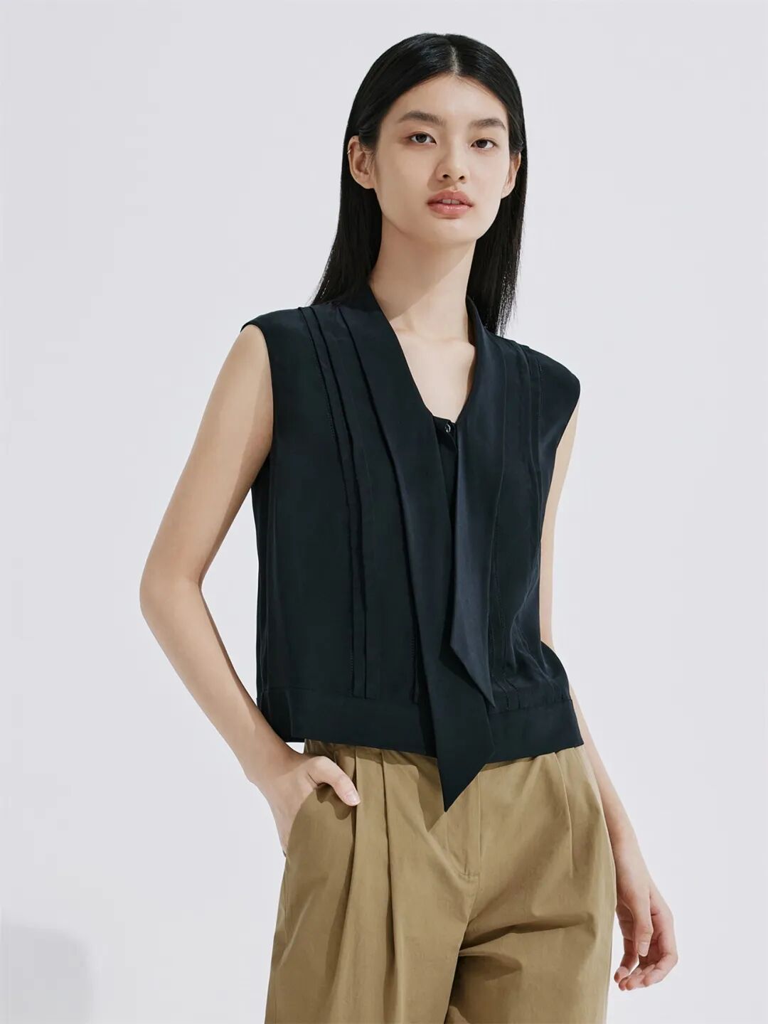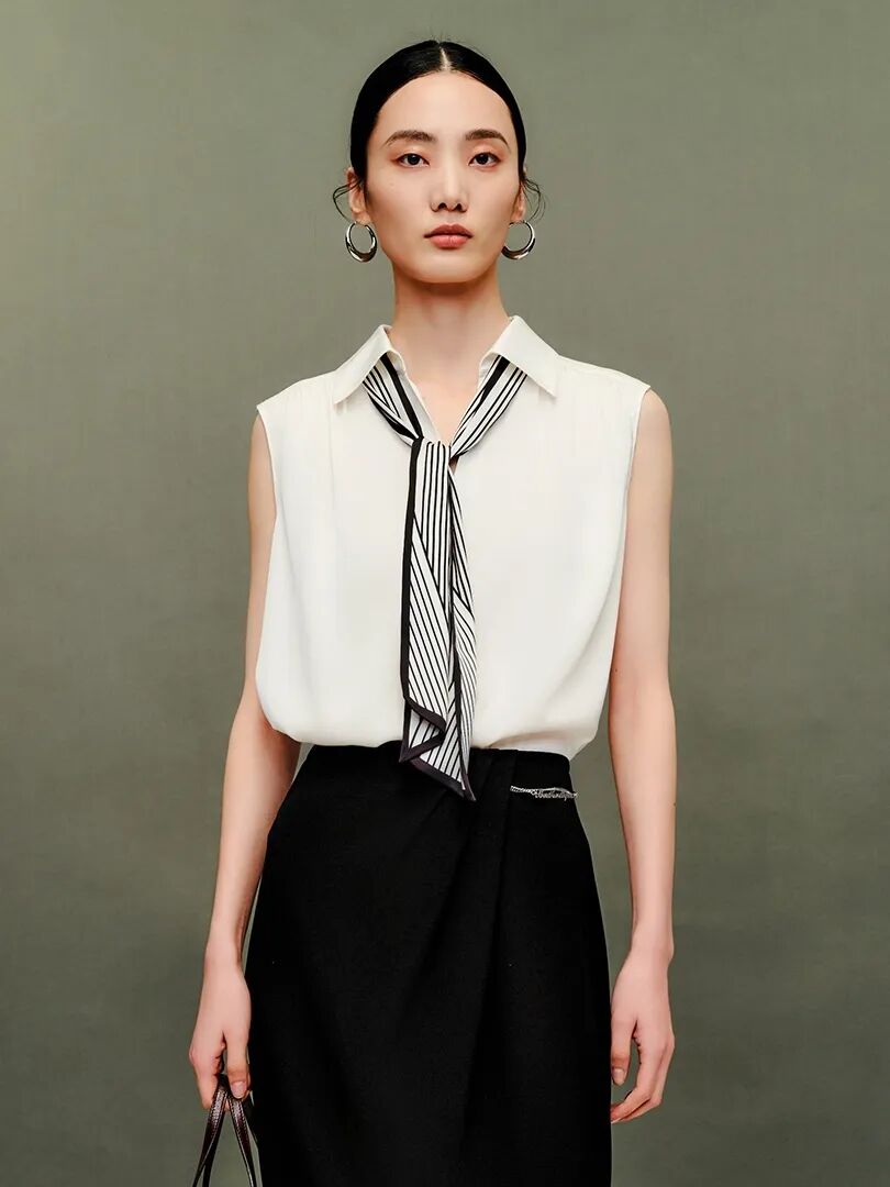 ▲桑蚕丝飘带领无袖衬衫¥1790,折后价¥1700