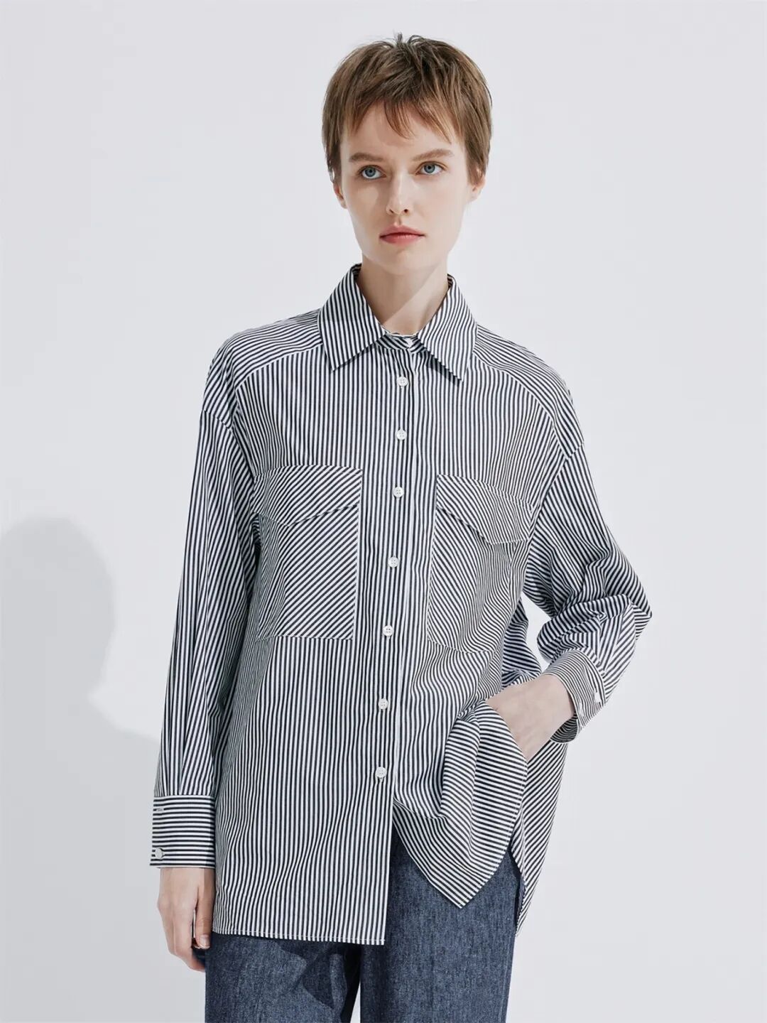 ▲纯棉条纹宽松长袖衬衫¥1590,折后价¥1510【点击购买】