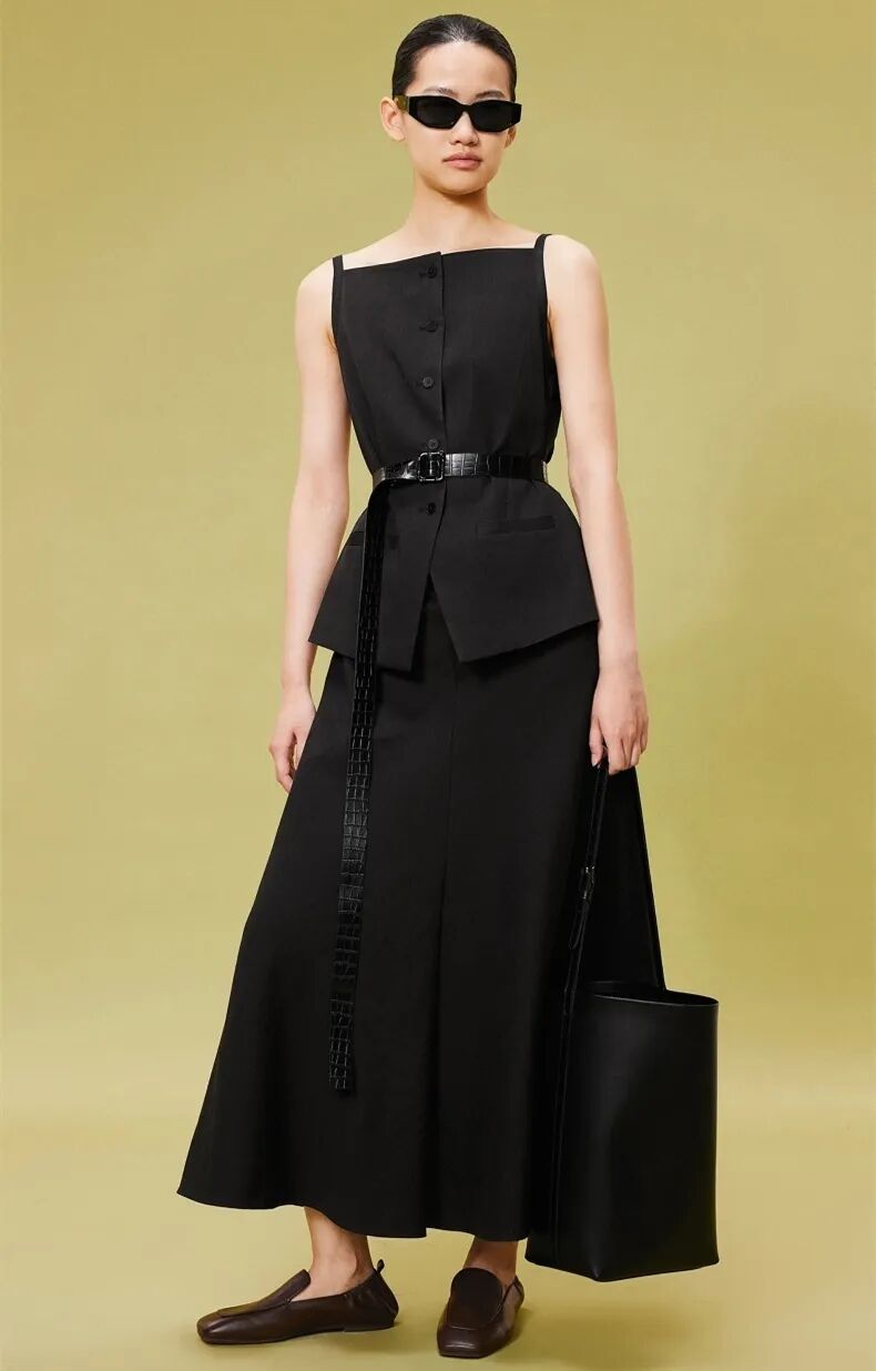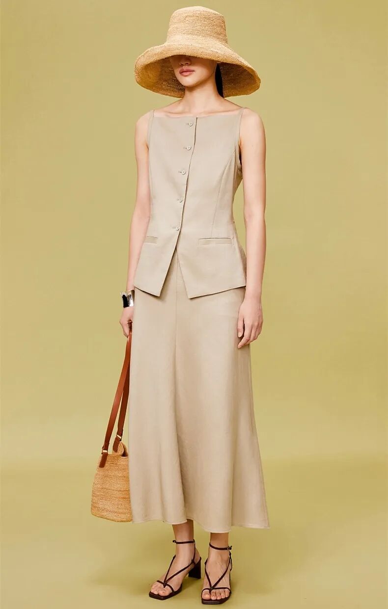 法式浪漫主义一字领吊带鱼尾裙,亚麻棉混纺带来清爽穿着感,独特剪裁视觉呈现马甲和半裙的假两件式,时装感满满。