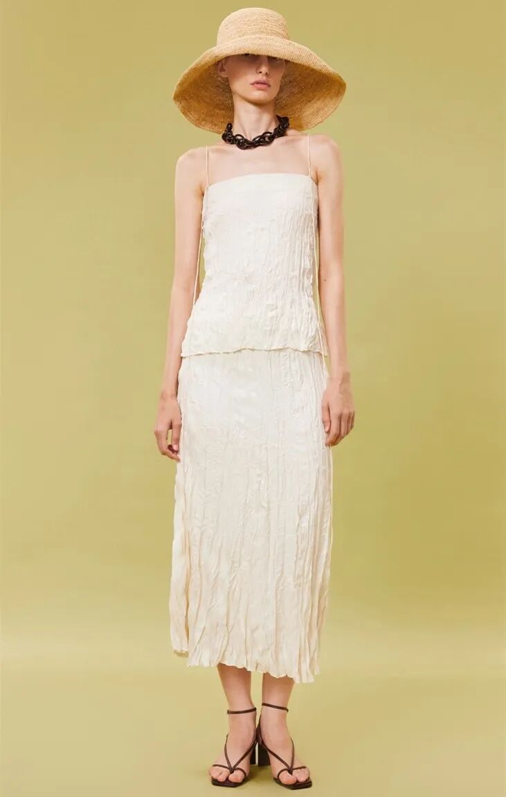 ▲桑蚕丝压褶吊带连衣裙¥2595,折后价¥2335